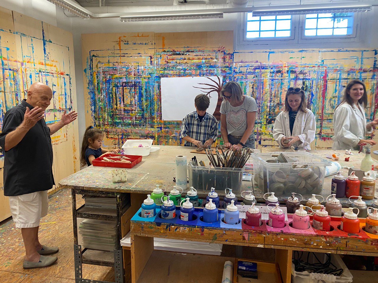 На фотографіях — безкоштовний сеанс арт-терапії для тимчасово переміщених українських дітей та дорослих в одній з творчих лабораторій Magenta Akademie GmbH. Тільки подивіться на цей інтер’єр! Як на мене, потрапивши у таку різнобарвну кімнату вже починаєш потроху забувати про війни, кризи та ініші проблеми навколишнього світу, і поринаєш у світ творчого самовираження. Фарба для вас додатковим способом комункації з навколишнім світом. Більше деталей про суть творчої терапії та місцеві методи мені у телефонній розмові розповів один із співзасновників академії — Ганс Рудольф Зурфлю (переклад з англійської):