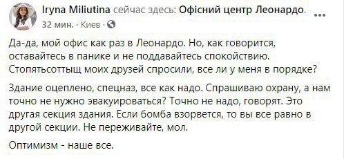 "Спрашиваю охрану, а нам точно не нужно эвакуироваться? Точно не надо, говорят. Это другая секция здания. Если бомба взорвется, то вы все равно в другой секции. Не переживайте, мол. Оптимизм - наше все".