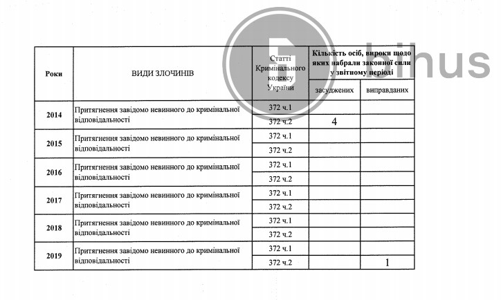 За точною статистикою редакція Bihus.Info звернулася до Державної судової адміністрації. Там повідомили, що за період з 2014 по 2019 роки включно було лише 4 обвинувальні вироки за ст. 372. При цьому усі – у 2014 році.