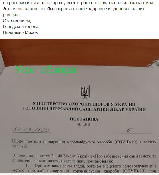Глава города Арциз сделал на своей странице в Facebook пост, в котором, ссылаясь на то самое постановление №5, утратившее силу, рассказал, что в городе "распространяются слухи, что с завтрашнего дня закрываются все продуктовые магазины и сельхоз рынок".