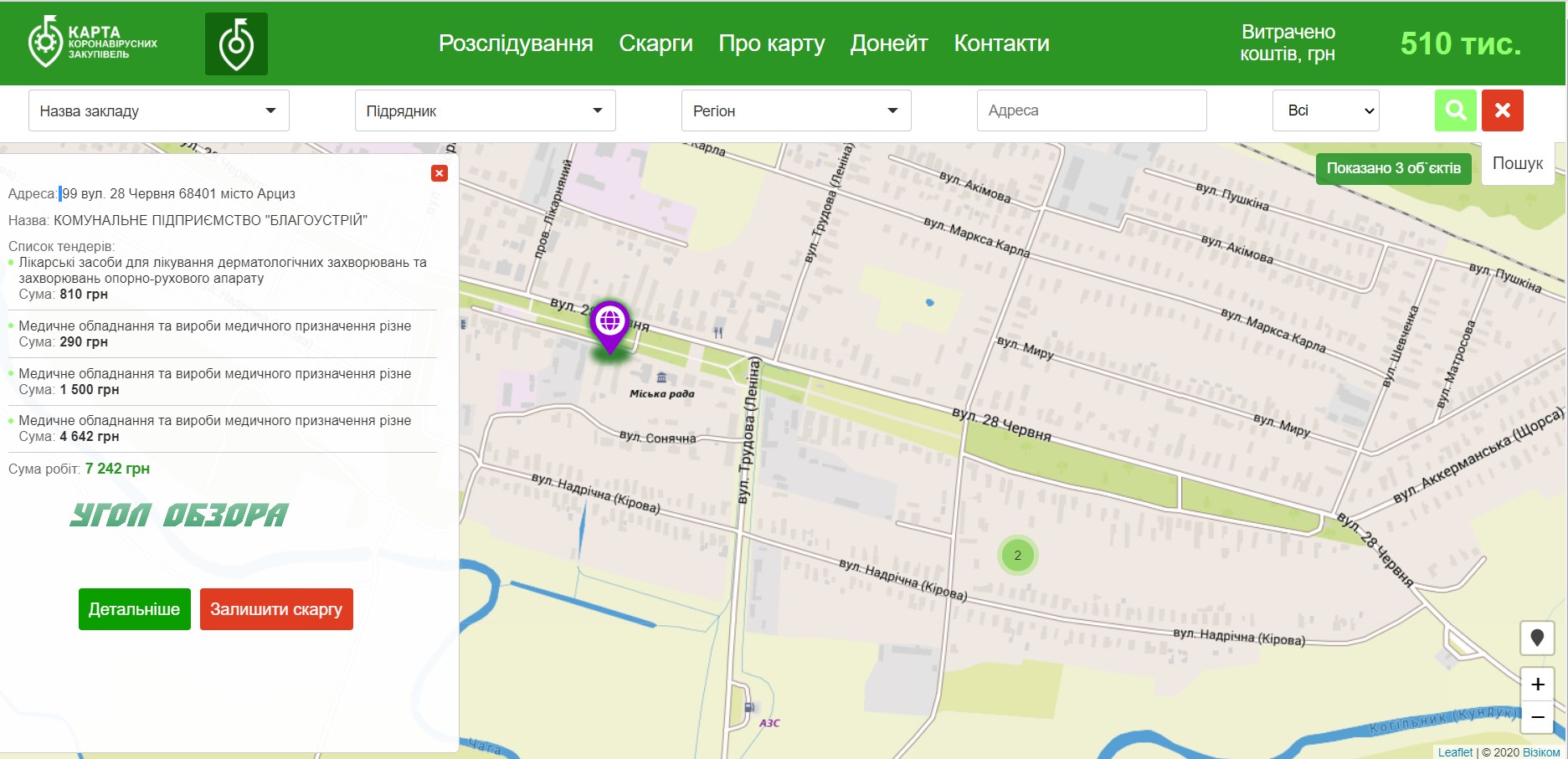 Городское коммунальное предприятие "Благоустрий" потратило чуть более 7 тысяч гривен. Как указано в данных карты, основной статьей расходов "Благоустрия" стала закупка под меткой "Медицинское оборудование и изделия медицинского назначения: разное", а также 810 гривен потрачено на "Лекарственные средства для лечения дерматологических заболеваний и заболеваний опорно-двигательного аппарата".