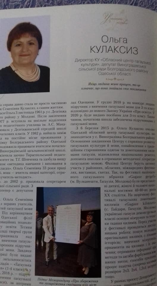 Ольга Кулаксыз попала в этот сборник не случайно, она автор двух учебников гагаузского языка, по которым школьники изучают родную речь. Кроме того, она в 2019 году была признана «Женщиной года» Болградского района в номинации «Общественно-политическая деятельность».