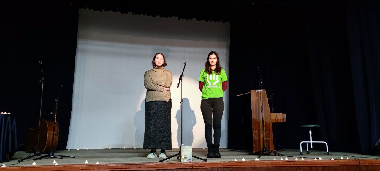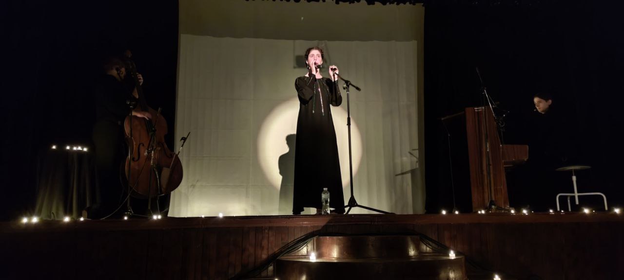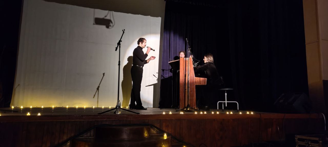 А далі почалось найцікавіше: у залі вимкнули світло і актори DAKHTRIO у складі Софії Баскакової, Ігоря Дімова і Володимира Руденко презентували потужне виконанні пісень на вірші Васила Стуса, які були написані під час його перебування у тюрмі.