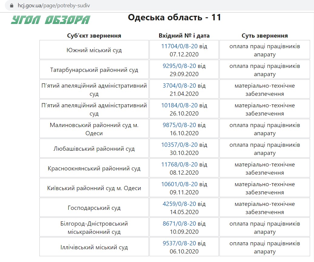Карту создавали, учитывая обращения от учреждений судебной власти в Высший совет правосудия из-за недостаточного обеспечения средствами. Всего таких обращений - 104, 11 адресованы ВСП учреждениями судебной власти, осуществляющими деятельность на территории Одесской области.