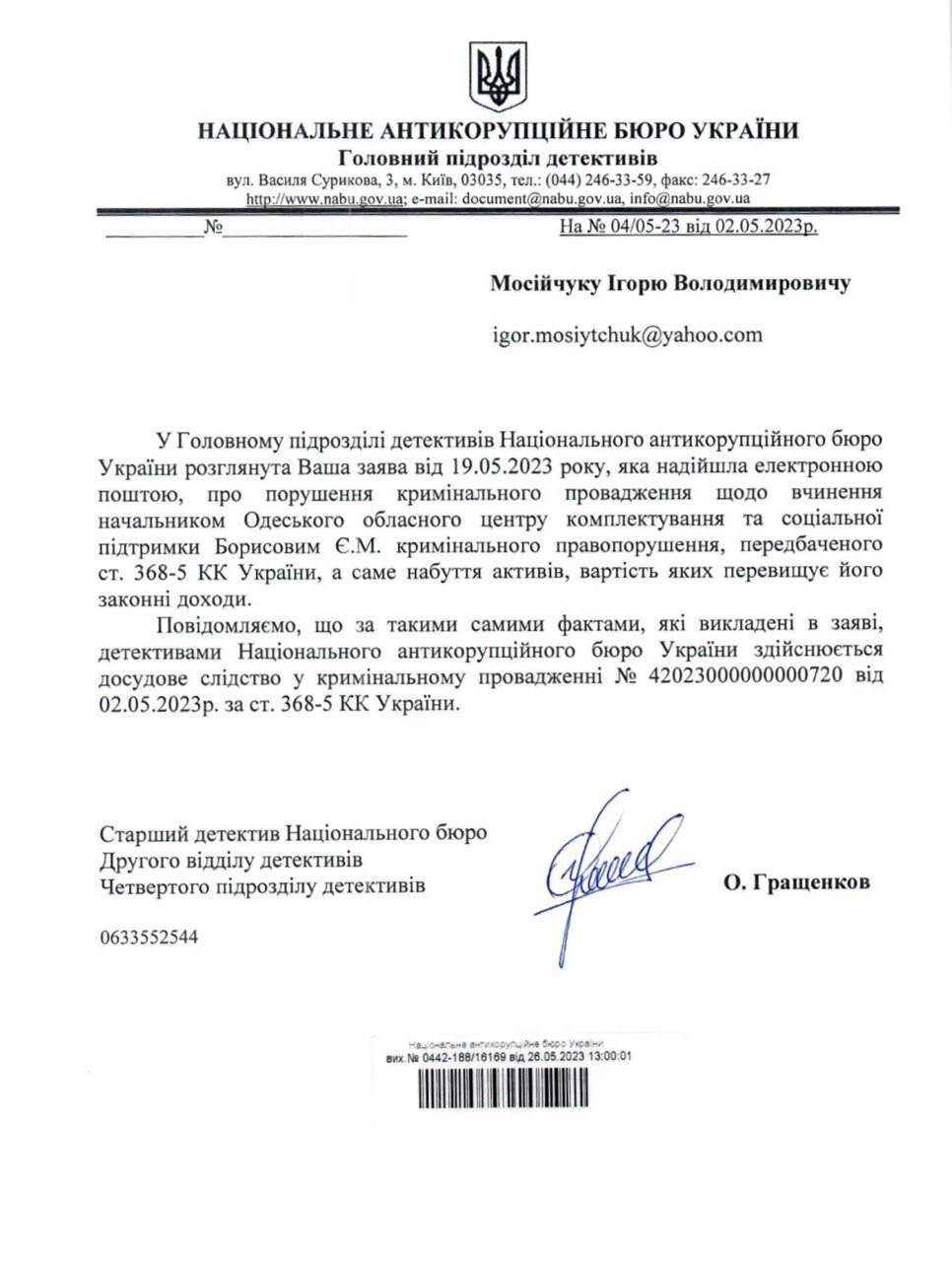НАБУ відкрило справу стосовно можливих корупційних дій воєнкома Одеської області Євгена Борисова. Про це редакція 368.media дізналася із повідомлення бюро у відповідь на лист екснардепа Ігоря Мосійчука.