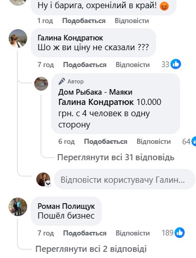 У коментарях до дописів автором зазначається вартість послуги — 10 тисяч гривень за човен на чотири пасажирські місця.