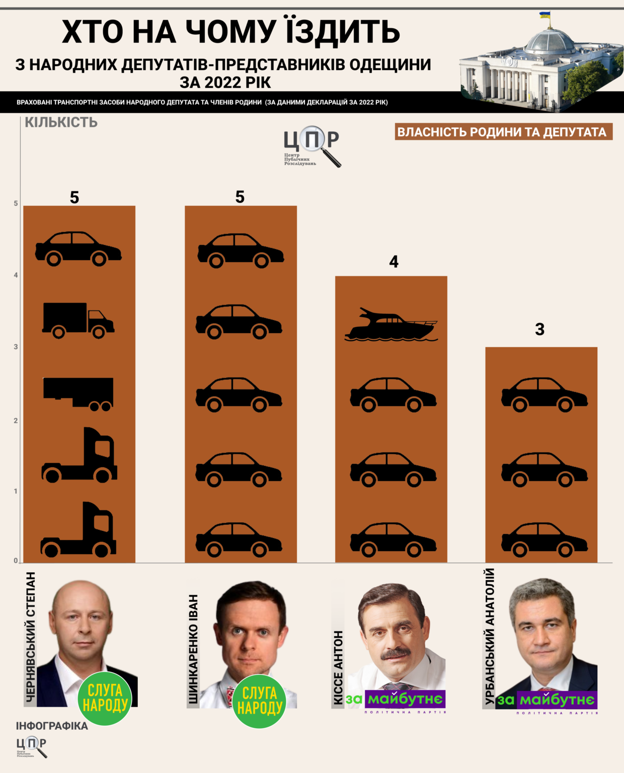 Деякі народні депутати-одесити полюбляють авто. Зокрема найбільше задекларованих транспортних засобів було у родини «Слуги народу» Степана Чернявського. Так, у 2022-му їм належали вантажівка, напівпричіп, напівпричіп-фургон, тягач та Mitsubishi. Ще один автопарк задекларував Іван Шинкаренко, зокрема це Ford, MAZDA, та два ВАЗи.