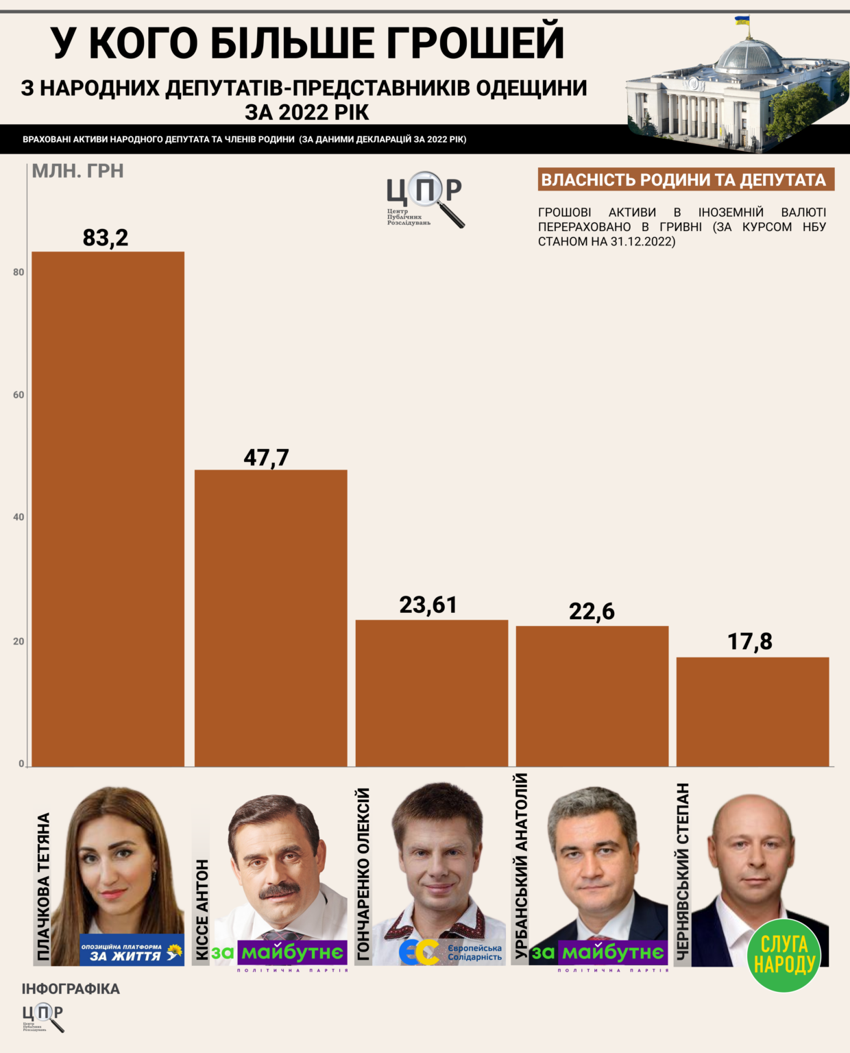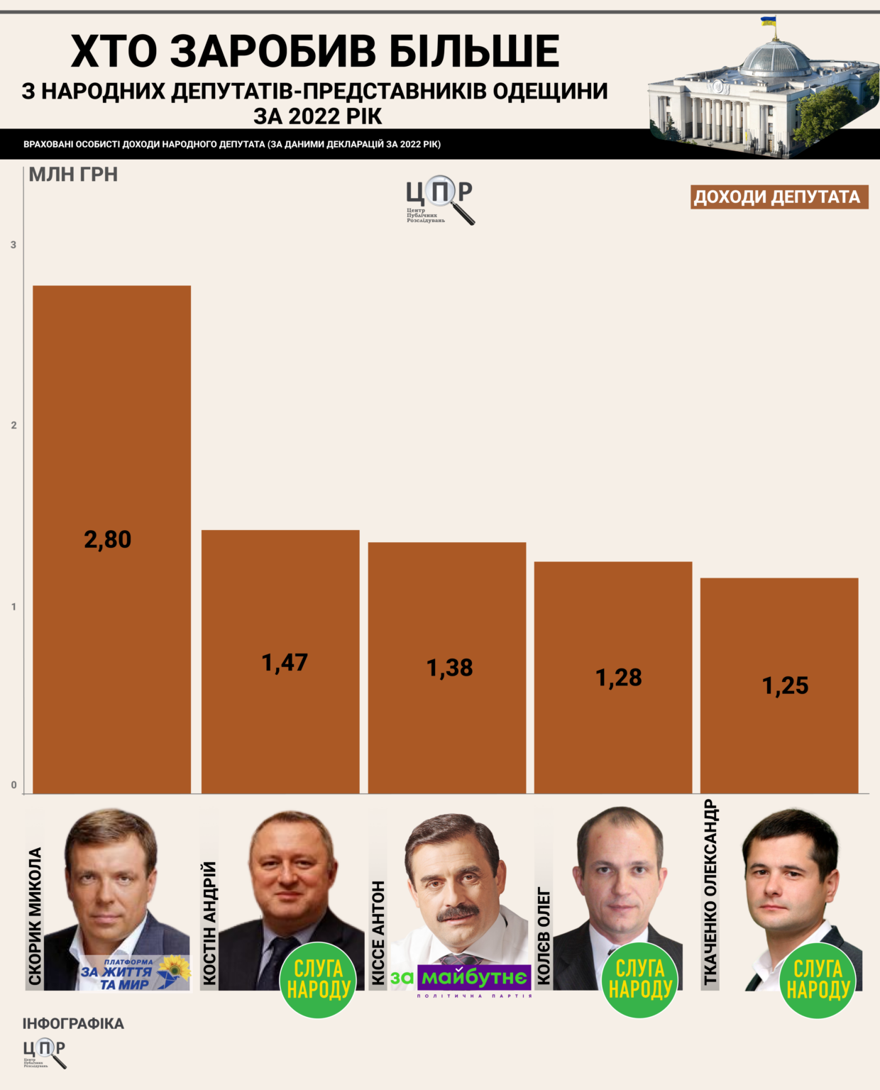Як повідомляє «Центр публічних розслідувань», Микола Скорик, народний депутат від забороненої партії «ОПЗЖ», що боровся з Геннадієм Трухановим за крісло мера на останніх виборах, очолює п’ятірку мільйонерів. Його доходи у 2022 році склали 2,8 мільйона гривень, більшість з яких він отримав з продажу майна. За ним — представник президентської партії Андрій Костін з доходами у 1,47 мільйона гривень, отриманих на посаді в апараті Верховної Ради і згодом на посаді Генерального прокурора.