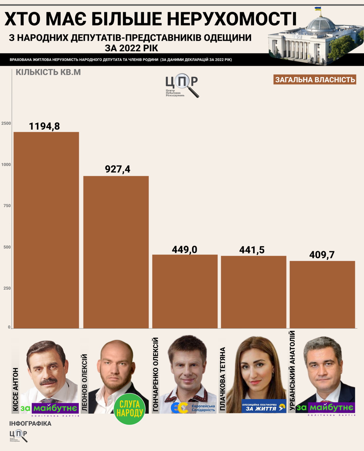 Останній в декларації вказав чималу кількість нерухомості загальною площею 1194,8 квадратні метри. Він та родина у 2022-му мали квартири в Одесі, Ізмаїлі, Болгарії, та приватні будинки в Авангарді та Євгенівці. У представника президентської партії, одесита Олексія Леонова у декларації теж вказувалась значна площа нерухомості — 927,4 квадратних метра. Це і квартира з будинком в Одесі, приватний будинок в Білгород-Дністровському, квартира в Таїровській громаді.