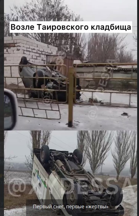 Первый снег, первые «жертвы». Возле Таировского кладбища в Одессе и по направлению в Одессу (Сухой Лиман) очевидцы засняли перевёрнутые автомобили.