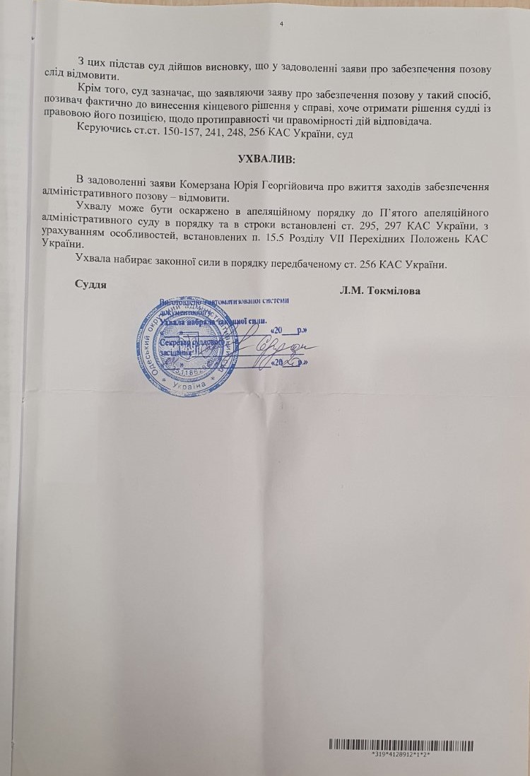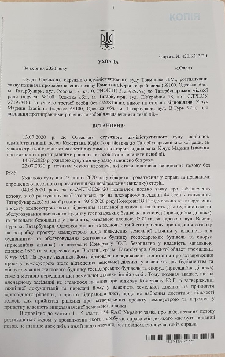 Обращаю Ваше внимание на то, что между 44 и 45 сессией гражданин Комерзан подал заявление в Одесский окружной административный суд об обеспечении иска к Татарбунарскому городскому совету о признании противоправными решения и обязать совершить определённые действия. Где ему было практически сразу отказано в обеспечении иска 04.08.2020 г. Видимо гражданин Комерзан лелеял себя надеждой найти коррупцию и в суде, когда подавал иск и может что-то ещё пытался дать! Но я на своём примере в очередной раз убедилась прозрачной работе судовой системы.