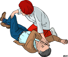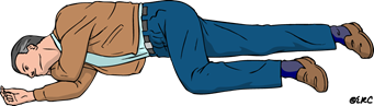 Дополнительно, особенно если пациент без сознания или сознание нарушено – не открывает глаза или не реагирует на голосовые оклики, или болевые раздражители (можно попробовать легонько ущипнуть человека) – то пациента стоит уложить в так называемое безопасное положение (ближнюю к себе руку отвести под прямым углом к телу, дальнюю от себя руку пациента приложить тыльной стороной к щеке, дальнюю от себя ногу согнуть в колене – используя согнутую ногу как рычаг, повернуть пострадавшего набок). Это необходимо для того, чтобы слюна, рвотные массы не попали в дыхательные пути. Так же у человека в бессознательном состоянии может западать язык, положение на боку помогает освободить дыхательные пути.