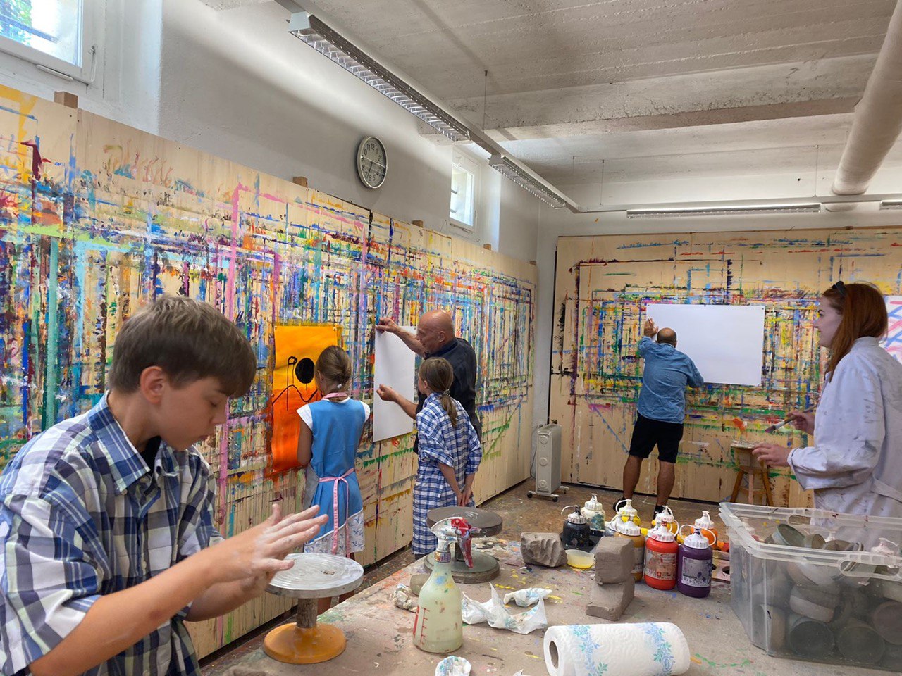 На фотографіях — безкоштовний сеанс арт-терапії для тимчасово переміщених українських дітей та дорослих в одній з творчих лабораторій Magenta Akademie GmbH. Тільки подивіться на цей інтер’єр! Як на мене, потрапивши у таку різнобарвну кімнату вже починаєш потроху забувати про війни, кризи та ініші проблеми навколишнього світу, і поринаєш у світ творчого самовираження. Фарба для вас додатковим способом комункації з навколишнім світом. Більше деталей про суть творчої терапії та місцеві методи мені у телефонній розмові розповів один із співзасновників академії — Ганс Рудольф Зурфлю (переклад з англійської):