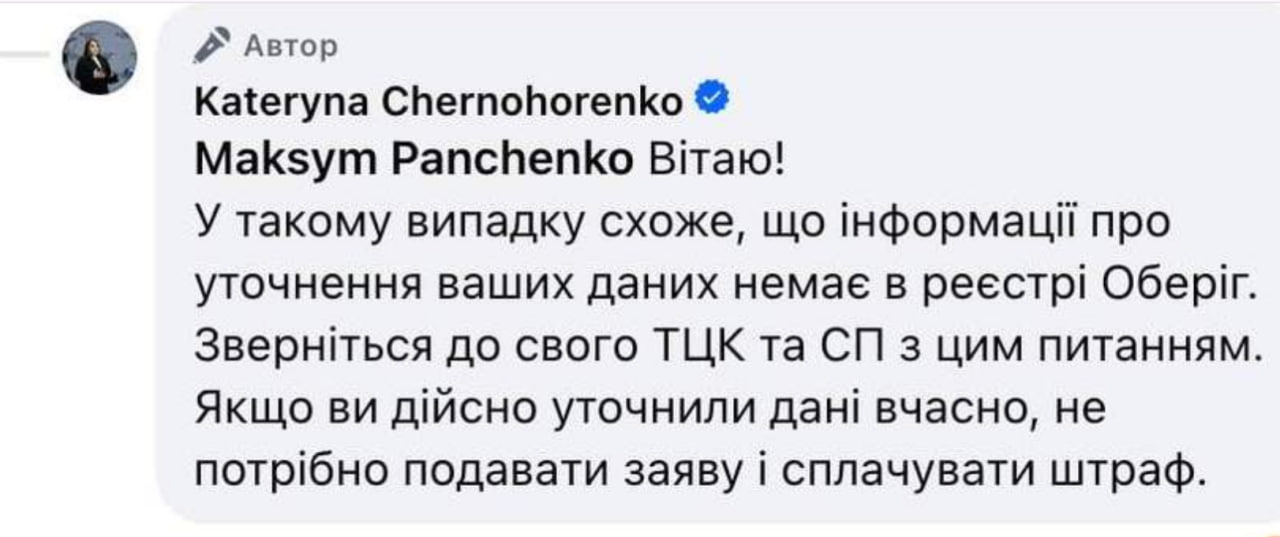 Черногоренко прямо каже: якщо ви не створювали в додатку заяву на сплату штрафу, то це повідомлення — лише наслідок помилки обміну даних між «Оберігом» та «Резерв+». Її слова цитує видання 7eminar.ua: