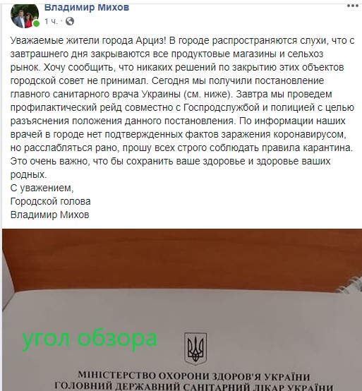 Глава города Арциз сделал на своей странице в Facebook пост, в котором, ссылаясь на то самое постановление №5, утратившее силу, рассказал, что в городе "распространяются слухи, что с завтрашнего дня закрываются все продуктовые магазины и сельхоз рынок".