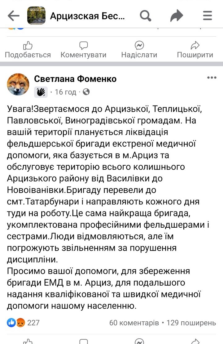 У повідомленні йшлося про те, що одну з бригад «Арцизької станції екстреної (швидкої) медичної допомоги Центру ЕМДіМК» переводять у Татарбунари. Але чомусь деякі учасники групи вирішили, що нашу «екстренку» закриють.