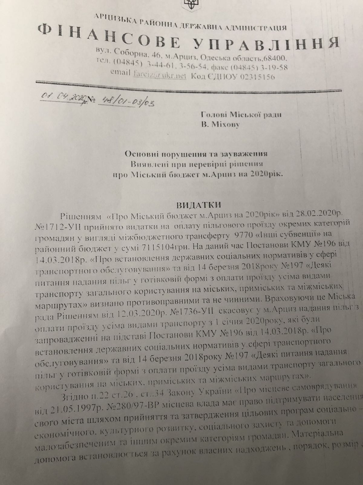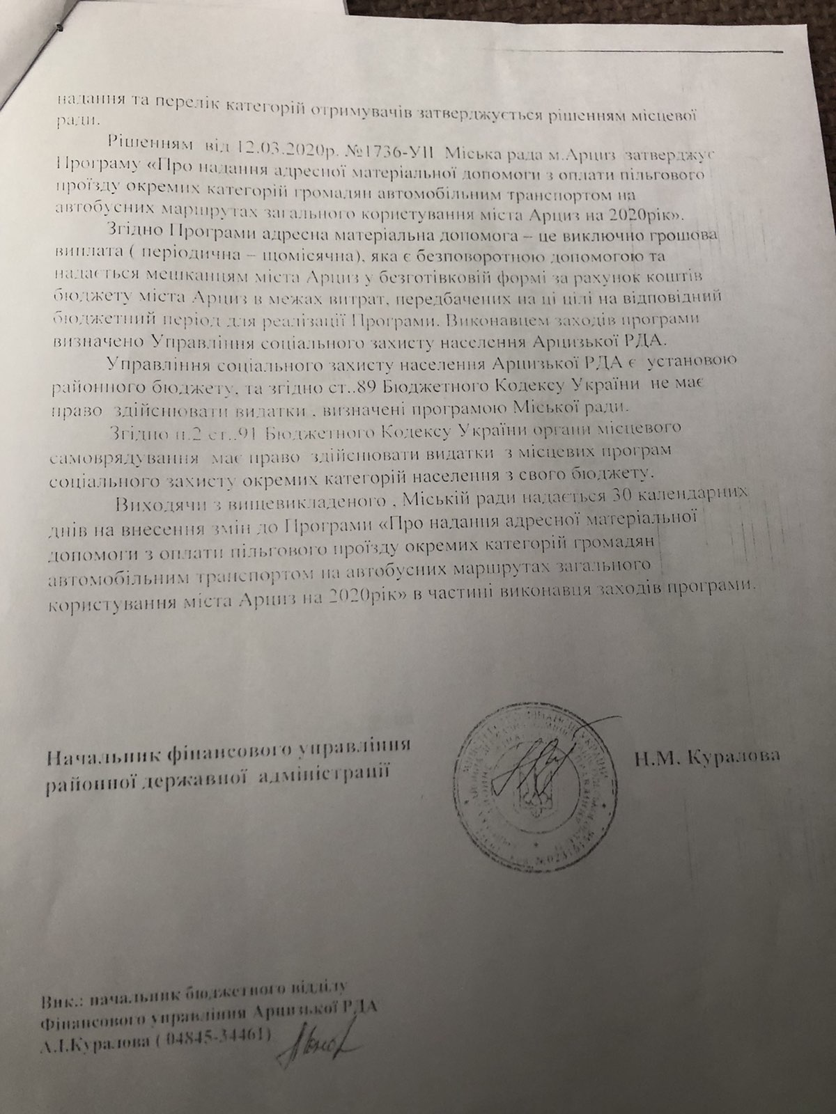 В письме от Кураловой Надежды Николаевны, начальницы финуправления Арцизской РГА (текст в фото ниже), главе города сообщается, что на сегодняшний день Постановления КМУ №196 и №197 признаны противоправными и не являются действующими. Учитывая этот факт, городской совет отменяет предоставление льгот всеми видами транспорта с 1.01.2020г., которые основывались на Постановлениях КМУ №196 и №197. Однако, как указывает начальница финуправления, местная власть имеет полное право поддерживать незащищённые слои населения путём принятия и утверждения целевых программ (ст.26 п.22 ЗУ «О местном самоуправлении»). Матпомощь осуществляется за счёт собственных доходов, а порядок предоставления и список льготных категорий утверждается решением местного совета.