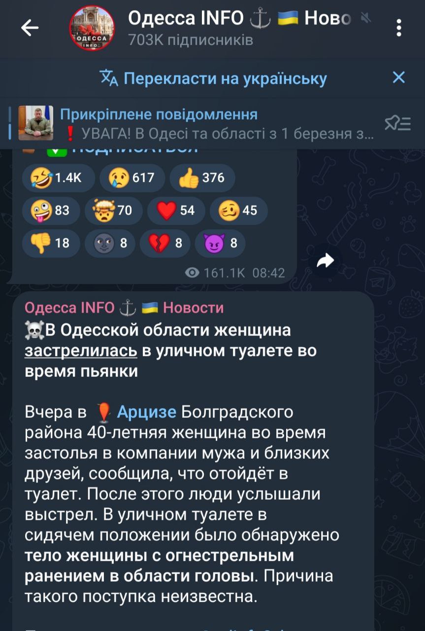 «Учора в Арцизі Болградського району 40-річна жінка в компанії чоловіка та близьких друзів, повідомила, що відійде до туалету. Після цього люди почули постріл. У вуличному туалеті в сидячому положенні було виявлено тіло жінки з вогнепальним пораненням голови. Причина такого вчинку невідома", - зазначають ЗМІ.