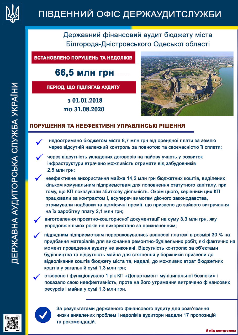 Сотрудники Южного офиса Госаудитслужбы завершили государственный финансовый аудит бюджета города Белгорода-Днестровского Одесской области, в ходе которого были обнаружены недостатки и нарушения на сумму 66,5 млн гривен.