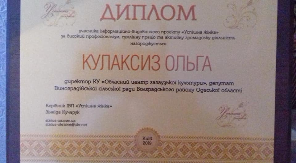 Статья об успешной деятельности Ольги Семеновны, директора Одесского областного центра гагаузской культуры в с. Виноградовка Болградского района опубликована в IX ежегодном сборнике, который издается в рамках информационно-издательского проекта «Успешная женщина». Проект преследует цель отражения социального статуса успешных, деловых и целеустремленных женщин в жизни страны и реализуется при поддержке Верховной Рады Украины.