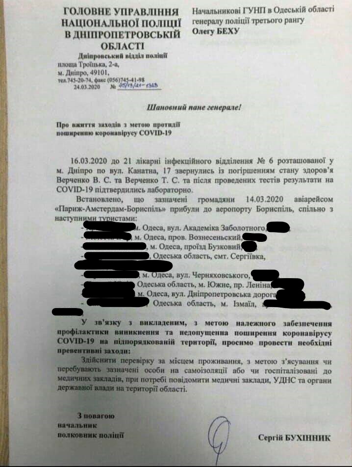 В социальных сетях появился документ, в котором полиция Днепропетровской области обратилась в ГУНП в Одесской области, с просьбой проверить жителей Одессы и Одесской области, вернувшихся 14 марта в Украину из Европы в одном самолете с мужчиной и женщиной, у которых выявили коронавирус.