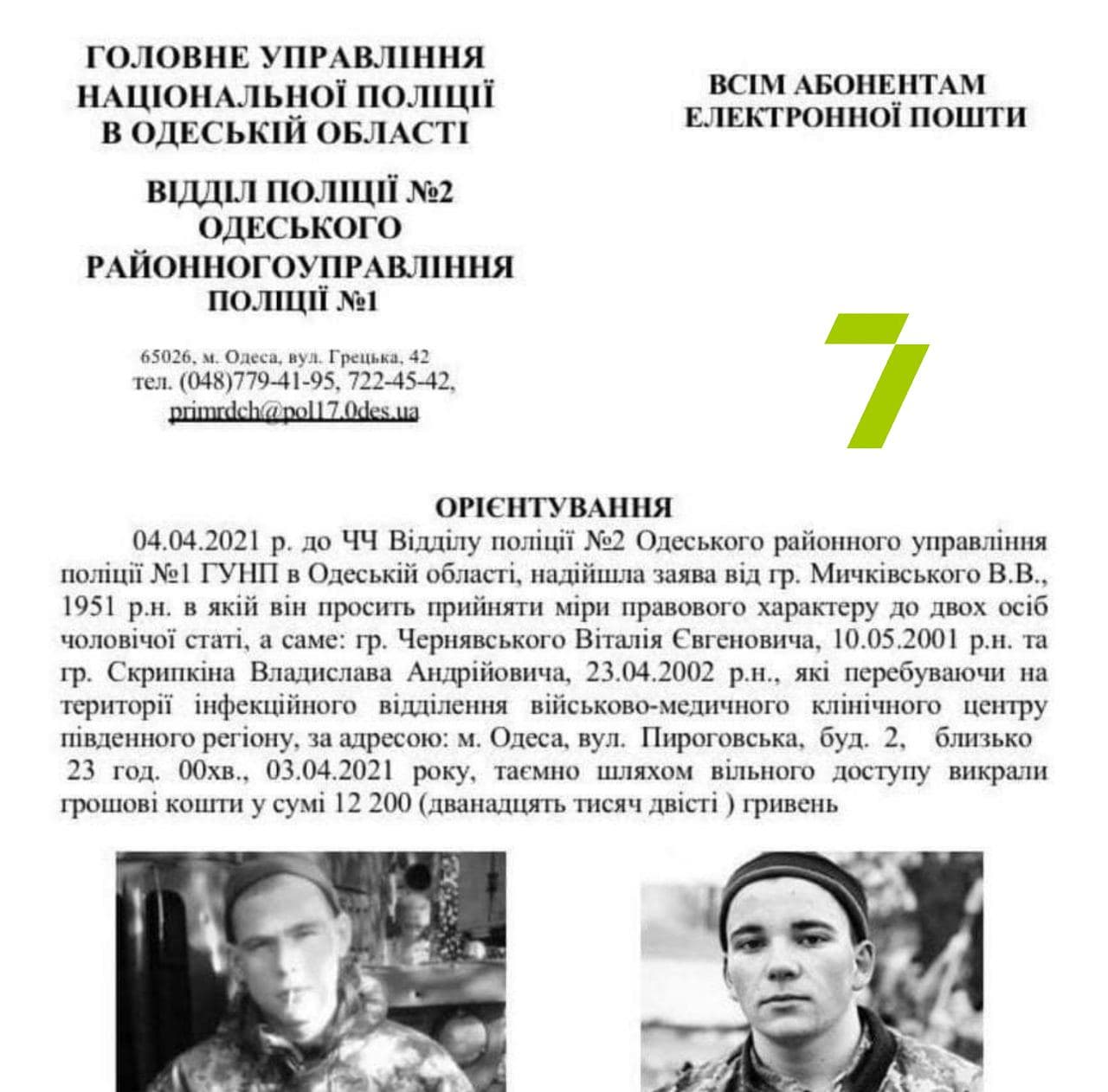 Согласно данным, опубликованным в ориентировке, 4 марта в отделение № 2 Одесского районного управления полиции №1 ГУНП в Одесской области обратился местный житель и заявлением и просьбой принять меры правового характера в отношении двух мужчин - 2001 и 2002 г.р. Согласно тексту ориентировки, два матроса пребывая в инфекционном отделении военного госпиталя, в 23:00 3 апреля совершили кражу, похитив 12 200 гривен.