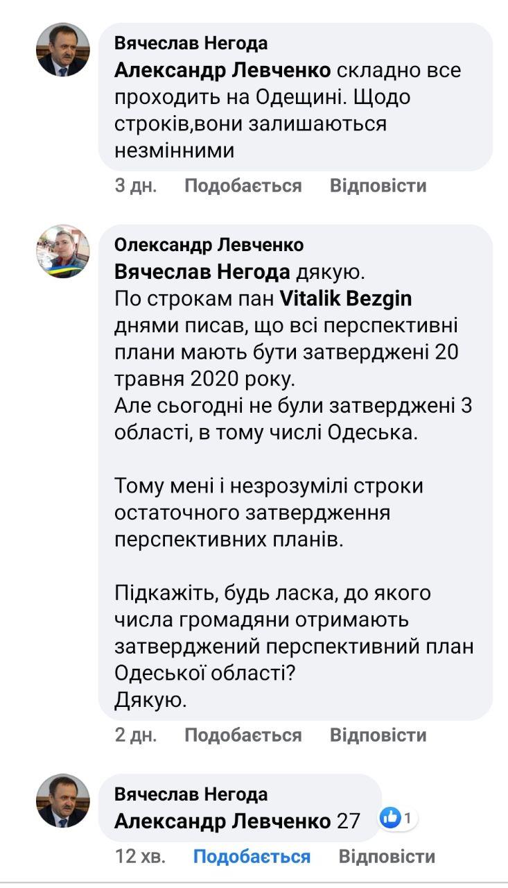 В обсуждениях к новости журналист Александр Левченко опубликовал скриншот переписки с Вячеславом Негодой, первым заместителем Министра регионального развития, строительства и ЖКХ. В переписке Негода отметил, что с Одесской областью всё сложно, однако сроки рассмотрения остаются неизменными.