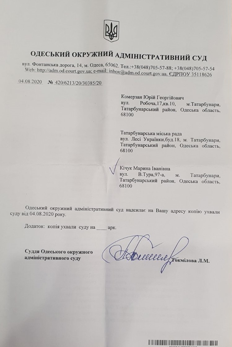 После всех неправомерных действий гражданина Комерзана, о которых я только узнала 26.03.2020 г., я подала заявление и пакет правоустанавливающих документов 27.03.2020 г. в Татарбунарский городской совет, где я была принята и услышана! И как только городской глава Андрей Петрович Глущенко и все депутаты 7 созыва Татарбунарского городского совета, разобрались, на заседании земельной комиссии и заседании 44 сессии 7 созыва Татарбунарского городского совета от 19.06.2020г., в чём дело, то ими всеми единогласно было принято и вынесено правомерное решение в мою пользу. На сессии все депутаты были в неподдельном недоумении и возмущении, каким же образом гражданину Комерзану удавалось так долго всех обманывать! Я была приятно удивлена честностью, порядочностью и бескорыстностью городского главы Глущенко А. П. и всех депутатов, в наше время - это редкость, и безгранично им благодарна за это!