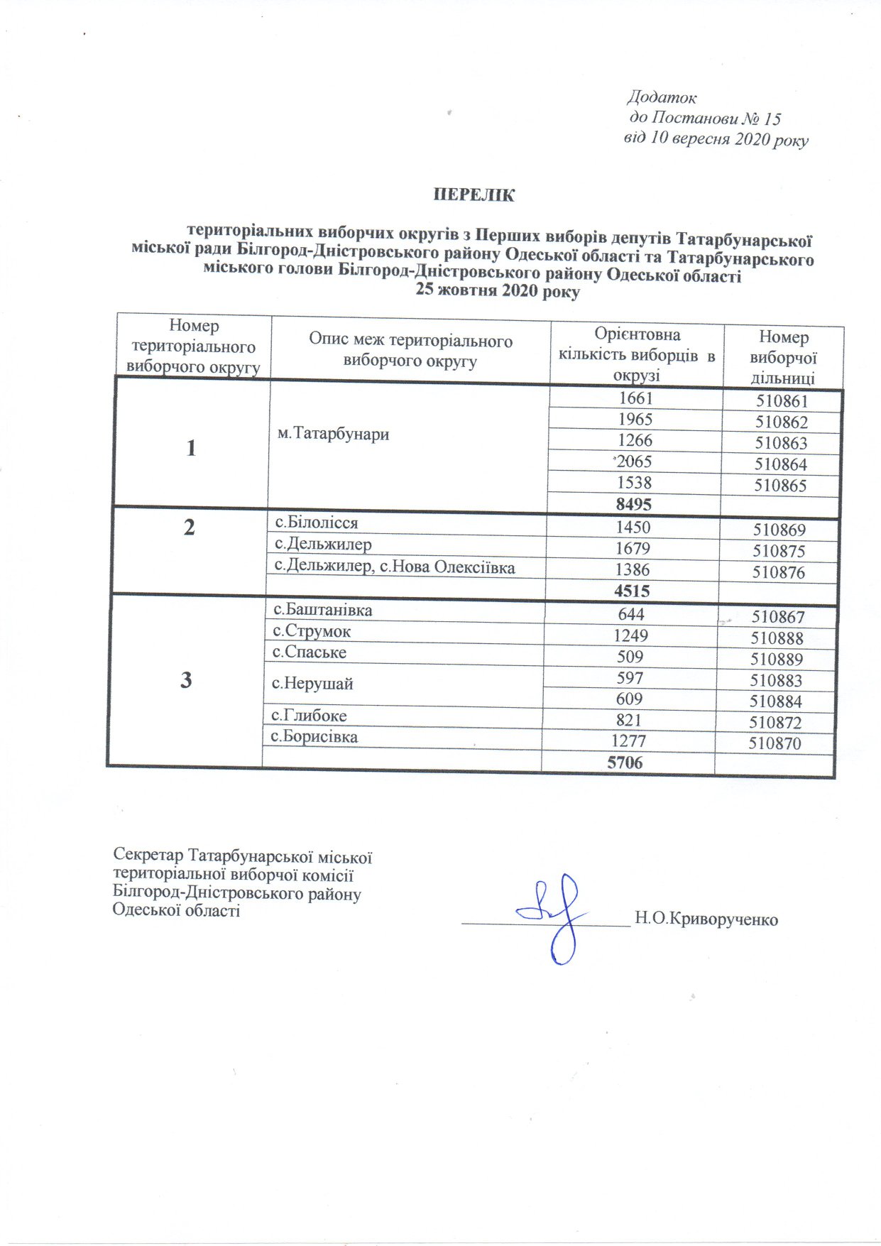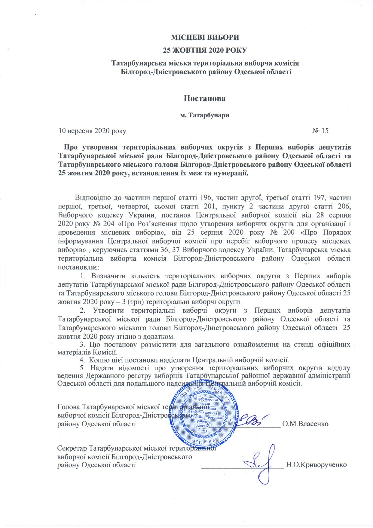 10 вересня Татарбунарською міською ТВК утворені територіальні виборчи округи в кількості 3 (три) з визначеними межами. Постанову та додаток до неї з описом округів додаю.